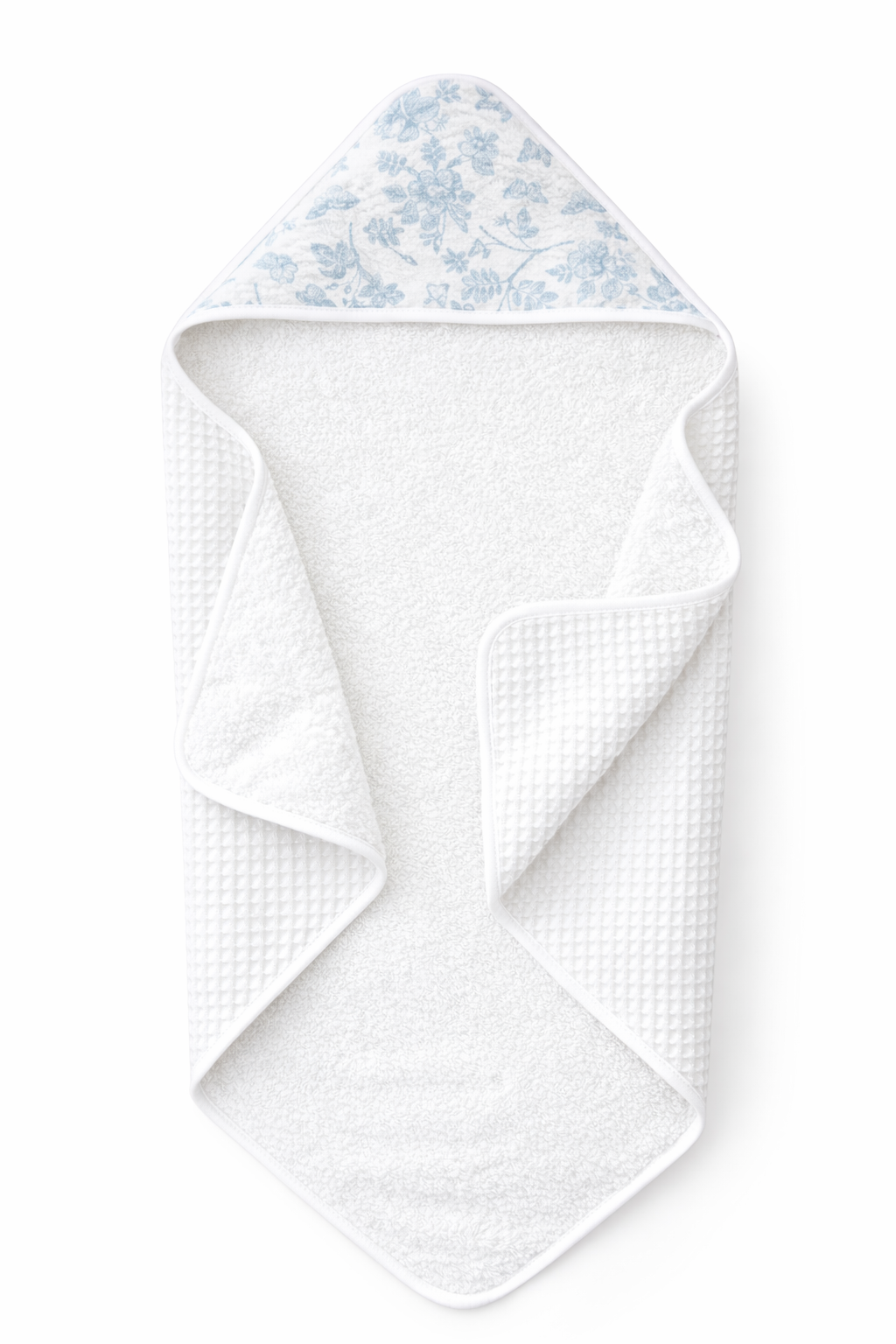 - Un jeu de matières unique : L’élégance du coton gaufré sur la face extérieure, le pouvoir ultra-absorbant de l’éponge à l’intérieur et la légèreté de la gaze de coton sur la capuche.